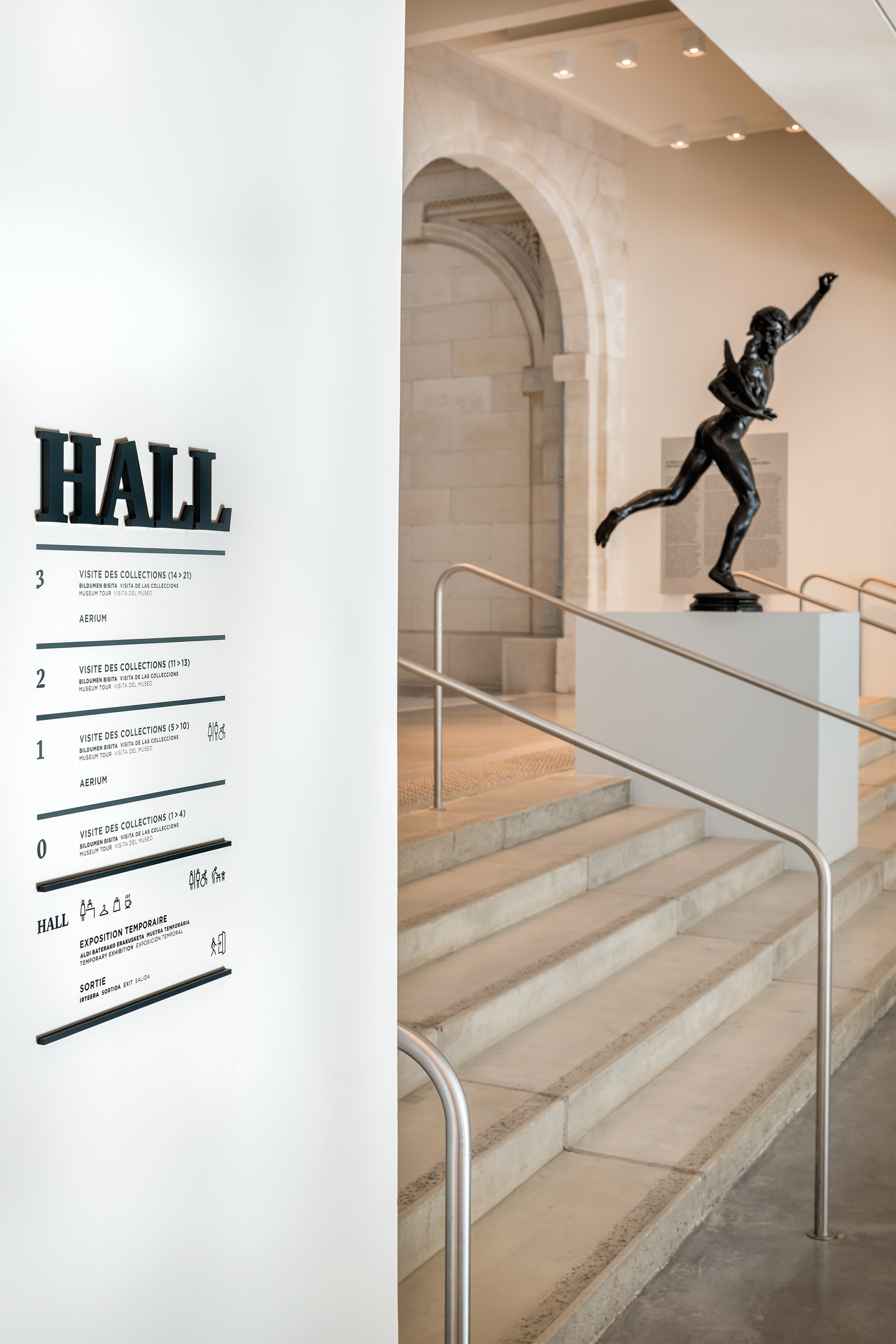 La signalétique a été pensée en cohérence avec le projet architectural et la nouvelle identité graphique du musée. Elle s’inscrit dans son territoire et s’adapte à un public international en intégrant cinq langues.